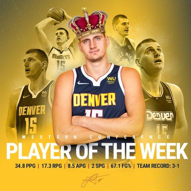 上周,掘金打出3胜1负的战绩,约基奇场均34.8分17.3篮板8.5助攻,状态极其出色。掘金官方晒图祝贺约基奇当选,配文道:“数据不言自明,把它加入MVP的荣誉列表中。”约基奇生涯11次当选周最佳,次数已经超过安东尼,创队史新纪录。
