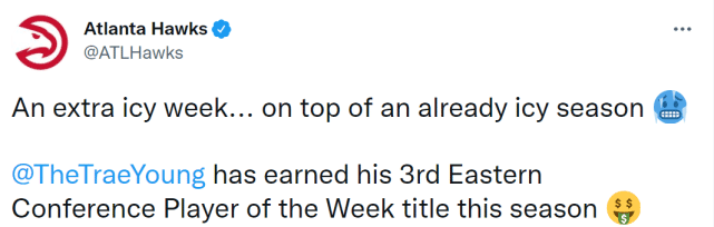 上周,老鹰打出4胜0负的战绩,杨场均30.3分10.8助攻3.3篮板。老鹰官方晒图祝贺杨本赛季第三次成为东部周最佳球员。这也让杨成为老鹰队史上第二位单赛季三次当选周最佳的球星,比肩老鹰队史名宿多米尼克-威尔金斯。