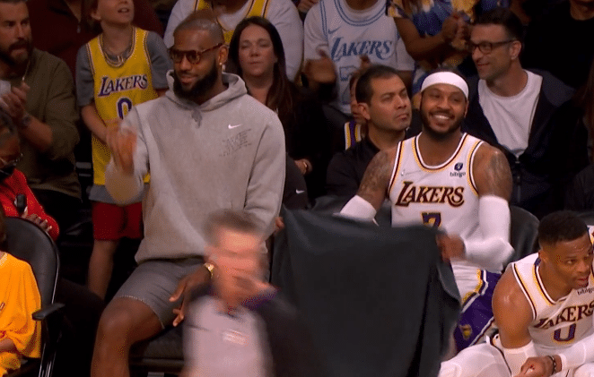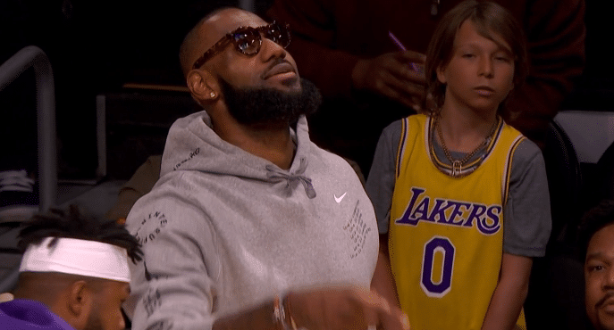 湖人球迷纷纷提前离场太沮丧,詹姆斯坐在场边,低头不语也很无奈。