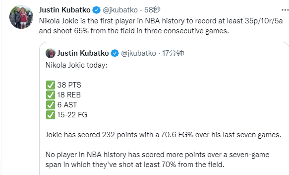 第四、约基奇成为2008年安东尼后第一位连续三场得分至少35+的掘金队球员。