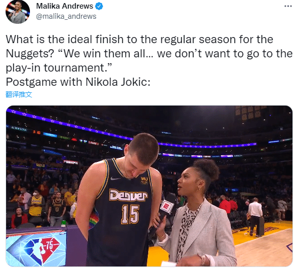 JRS直播04月04日讯 ,目前掘金46胜32负排名西部第6,领先排名第7的森林狼2个胜场;赛后谈到本赛季剩余常规赛的目标,约基奇表示:我希望我们都能赢下来,这个目标对我们来说很简单,我们不想打附加赛,我们要守住第6名的位置。