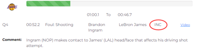 终场前52.2秒,詹姆斯持球杀到禁区上篮,被鹈鹕两名球员包夹,丢球后老詹捂着面部,底线裁判没有任何吹罚;裁判报告指出,詹姆斯上篮时被英格拉姆打到面部/头部,这影响了詹姆斯的上篮,当时应该吹罚英格拉姆防守犯规,这是一次关键漏判,詹姆斯本该获得两次罚球。