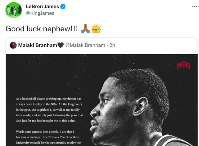 JRS直播04月02日讯 ,俄亥俄州大的18岁新星马拉基-布拉纳姆宣布参加NBA选秀,湖人球星勒布朗-詹姆斯第一时间转发并送上祝福:“好运,侄子!”