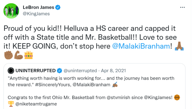 詹姆斯一直关注布拉纳姆的成长,这位年轻人当选俄亥俄篮球先生时,詹姆斯也曾专门更新社媒送上祝贺,称赞他已经获得的成就,并鼓励他继续前进。