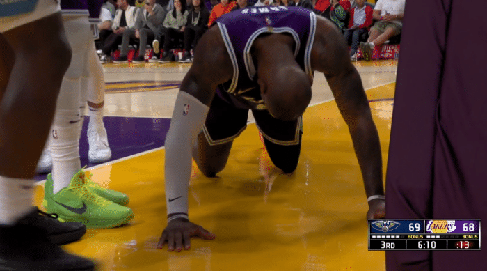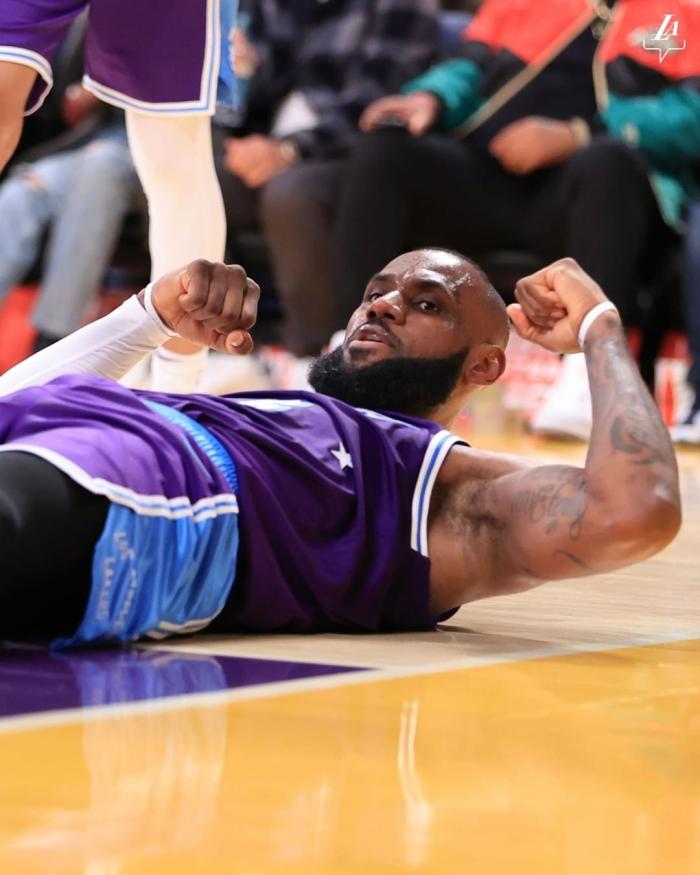 下半场,37岁詹姆斯第三节开启全力詹模式,一招碾压突破上篮太无解,扛着对手强硬2+1,杀到篮下被撞倒仍打成2+1,外线三分也有,单节10投6中独砍21分;詹姆斯拼尽全力,与英格拉姆争夺球权,鱼跃救球直接摔出场外,突破上篮惨遭英格拉姆打脸凶狠恶犯放倒,老詹起身后二话不说,继续专注于比赛。