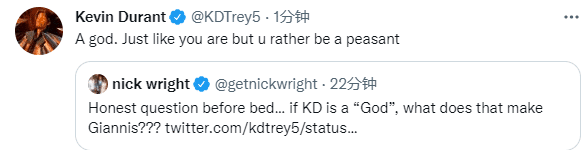 Nick Wright回复杜兰特:如果KD你是上帝,那扬尼斯是什么呢?杜兰特:上帝!就像你一样,你宁愿只做一个平民。