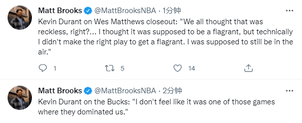 赛后谈到篮网惜败雄鹿,杜兰特表示:我不认为这是他们统治我们的一场比赛;谈到关键时刻外线三分被马修斯撞倒,杜兰特表示:我们都认为那个犯规有些鲁莽,没错吧?我认为这应该是一次恶意犯规,但从技术上讲,我没有做出正确的动作来博取一次恶犯,我应该仍然保持身体在空中。