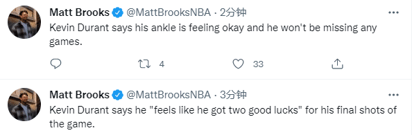 杜兰特谈到脚踝伤势:我受伤了,这是连续两场比赛,当我投篮时,有球员撞倒了我;KD还透露他的脚踝无碍,不会缺席任何的比赛;谈到错失绝杀,杜兰特表示他觉得自己最后几次投篮的“运气不错”。