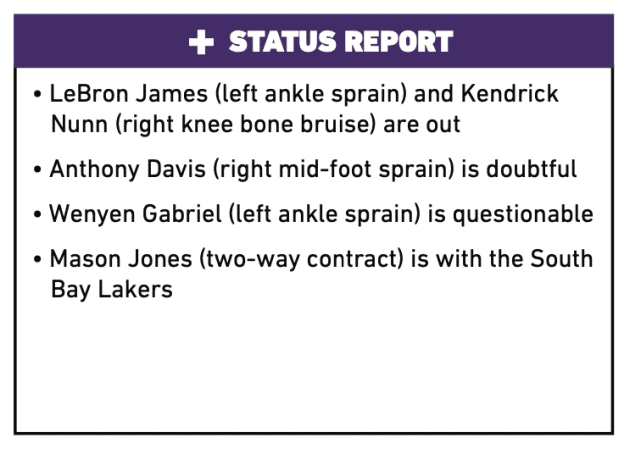 湖人官方公布了最新的伤病报告。詹姆斯(左踝扭伤)和纳恩(右膝骨挫伤)将缺战明天客场对爵士的比赛,浓眉(右中足扭伤)的状态是doubtful(小概率复出,上场可能性25%),加布里埃尔(左踝扭伤)的状态是questionable(出战成疑,上场可能性25%)。