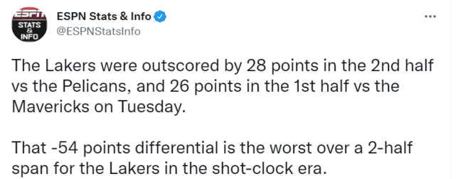 JRS直播03月31日讯 ,ESPN数据显示,对独行侠一战的上半场湖人56-82净负26分,而对鹈鹕的下半场比赛,湖人39-67净负28分。湖人连续两个半场累计净负54分,创下队史计时器时代连续两个半场失分的最高纪录。