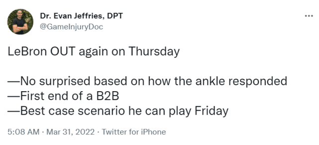医学专家Evan Jeffries表示,基于詹姆斯左踝目前的反应,他再次缺席并不奇怪。另外这是湖人背靠背的第一场球,最好的情况是詹姆斯能在周六(北京时间)的比赛中复出。之前,Evan Jeffries曾推断詹姆斯的真实伤情是二级扭伤,可能要休息数周,如果詹姆斯能这么快复出,只能说是奇迹了。