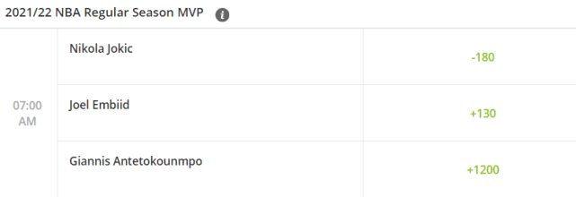 最新的MVP赔率如下:约基奇(-180)、恩比德(+130)、字母哥(+1200)。在常规赛即将结束的时候,恩比德的领跑位置被约基奇取代,意味着恩比德当选MVP的看好程度在下降。他的个人数据依然很出色,但76人接连输掉两场硬仗,不敌太阳和雄鹿。而这两支球队里,都有被列入MVP讨论范围的球员:布克和字母哥。
