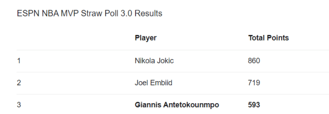 JRS直播03月31日讯 ,近日,ESPN也召集媒体人对MVP的归属进行第三次投票调查,结果和赔率榜显示的一致。约基奇得到860分,位居第一,恩比德719分,排名第二,字母哥593分,位居第三。你认为最终MVP会属于哪位球星呢?欢迎留言发表见解。