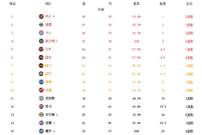 热火锁定季后赛席位,但本赛季东部第一的争夺依旧相当激烈,最几天时间,榜首球队已经多次更换,如下: