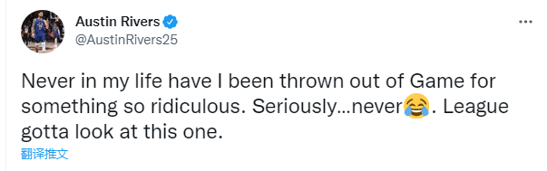 小里弗斯发推表达了自己的心情,他写道:“我这辈子从没因这么离谱的事被驱逐过。真的...从没有过,联盟得再回看下这球。