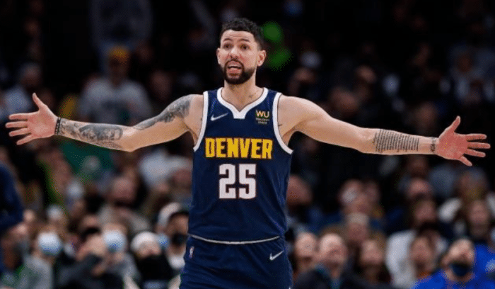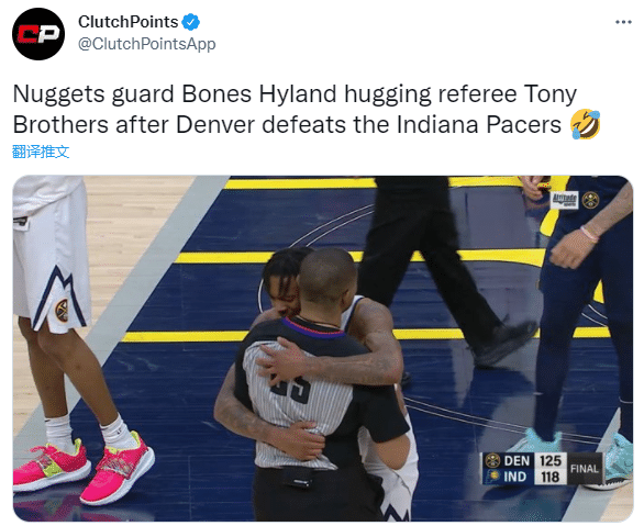 掘金赢球赛后,掘金后卫海兰德拥抱裁判托尼兄弟。