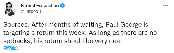 泰伦-卢透露乔治已经参加了5V5的训练,快船记者Farbod Esnaashari跟进报道,保罗-乔治的目标是本周复出,乔治回归倒计时,这是快船冲击季后赛的一大利好;本赛季乔治场均拿到24.7分7.1篮板5.5助攻,目前快船36胜39负排名西部第八。