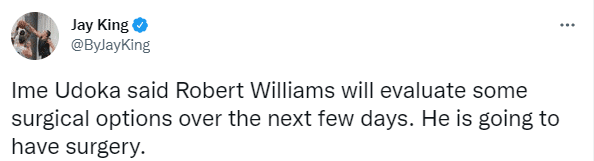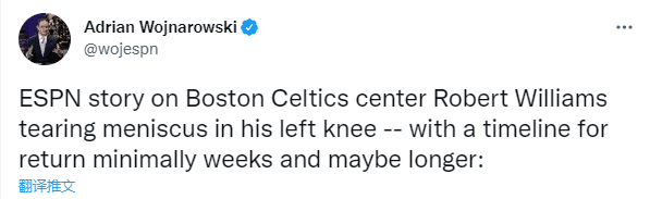 据名记沃纳罗斯基报道,凯尔特人首发中锋罗伯特-威廉姆斯(罗威)遭遇左膝半月板撕裂的伤病,之后凯尔特人主帅乌度卡表示罗威将在接下来的几天他接受手术治疗,他的伤停是对绿军的一大重创,本赛季能否复出取决于他做什么样的手术。