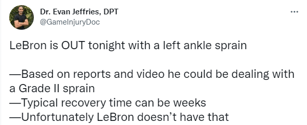 究竟詹姆斯的脚踝伤势有多严重?医学专家Evan Jeffries表示,勒布朗因左脚踝扭伤而缺席今天的比赛,根据报道和受伤画面,他可能遭遇二级扭伤,可能需要几周的康复时间。