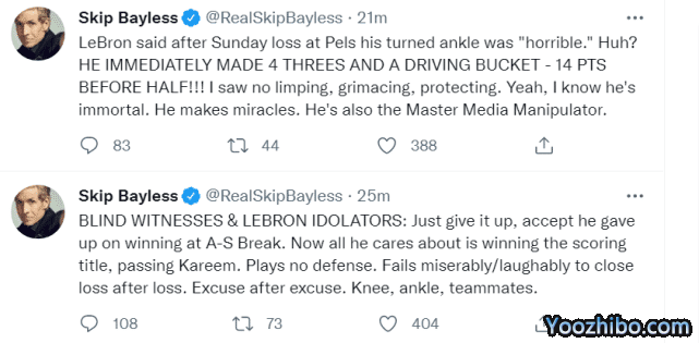 他还写道:“勒布朗在输给鹈鹕的比赛后说,他扭伤的脚踝‘很糟糕‘’。嗯?他(在受伤后)立刻投中了4个三分和1次上篮,在半场结束前得到14分!我没有看到一瘸一拐,痛苦的表情,以及任何保护。是的,我知道他是不朽的,他能创造奇迹,他也是媒体操纵大师。”