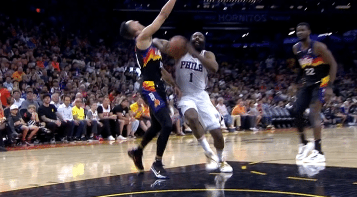 第二节还剩下7分18秒的时候,哈登换下小乔丹,一上来哈登的三分球投丢,同时进攻端在突破过程有打到沙梅特的脸,被吹一级恶意犯规,太阳队两罚一掷。哈登突破之后的上篮被布克大帽但对手犯规,哈登两罚全中。上半场的哈登得到12分3篮板4助攻的数据,76人一度领先15分,但被太阳追到分差只有4分。