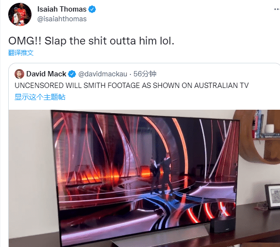 黄蜂球员布里奇斯发推:为什么我在比赛结束后看到的第一件事就是威尔-史密斯掌掴主持人;小托马斯转发视频并发推:我的天呐,真给了他一巴掌。