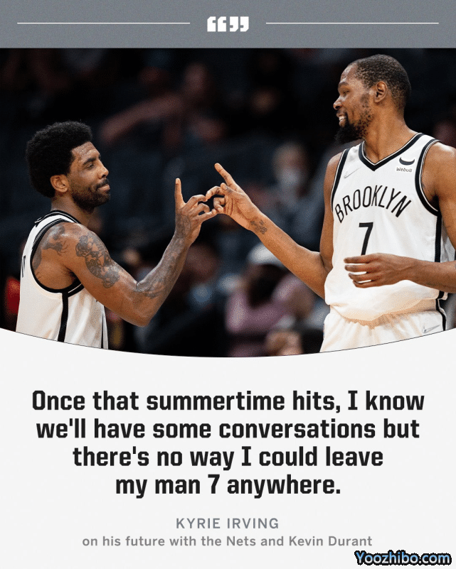 “我喜欢这里(布鲁克林),”谈到续约话题时,欧文说道,“等到夏天来了,我知道我们会进行一些对话,但我不可能离开我的7号兄弟。”显然,这里的7号指的是杜兰特,他在篮网身穿7号球衣。