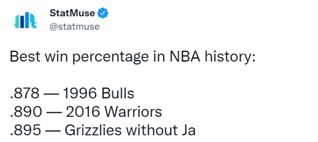 美媒StatMuse第一时间调侃,NBA历史上最高的胜率:1996年公牛87.8%,2016年勇士89%,而本赛季没有莫兰特的灰熊89.5%!
