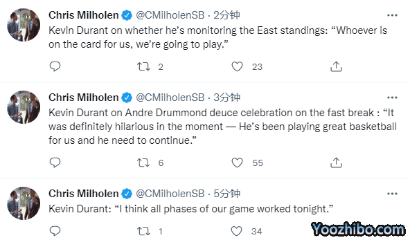 谈到是否关注篮网排名,杜兰特表示:无论谁和我们对阵,我们都会上场的。