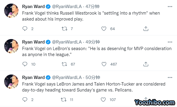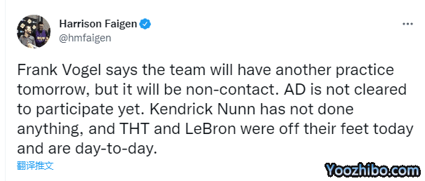 湖人全队训练之后,沃格尔接受采访,希望詹姆斯和霍顿-塔克可以出战下一场与鹈鹕的比赛,还表示浓眉还未获准参加队内非接触式训练,沃帅还直言詹姆斯本赛季有资格拿MVP。