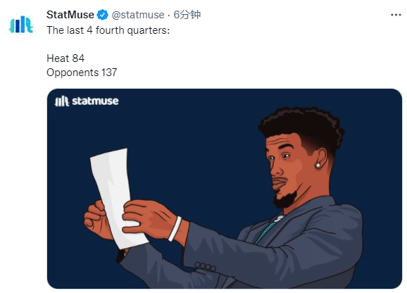 热火三连败也变成伪强队吗?据美媒StatMuse统计,热火在过去三场比赛的第四节总共只得到67分,而让对手得到了108分,相当于三场末节狂输41分;在此前两场比赛中,热火在末节分别得到24分(对阵勇士)和28分(对阵76人)。