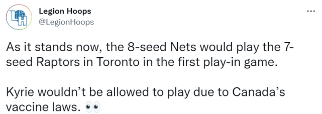 篮网在缺少欧文的情况下,主场获得16胜19负的战绩,他们在主场的进攻效率只有108.8,而在客场飙升到116.7。如果按目前排名打附加赛,篮网要客场打猛龙,加拿大防疫规定没变,欧文仍不能出战那场比赛。