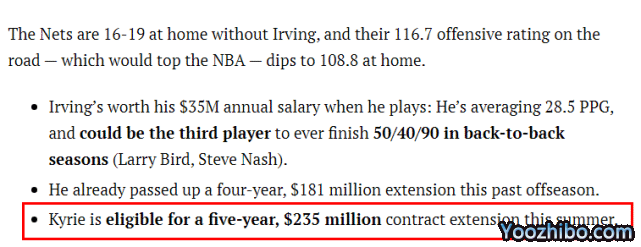 欧文此前缺席了35场主场比赛,损失了大约1600万美元的薪水,并放弃了4年1.81亿美元的提前续约机会。美媒指出,欧文有资格在今年夏天获得一份最高5年2.35亿美元的顶薪合同。不过,考虑到欧文拒绝接种疫苗的坚定立场以及此前的种种问题,篮网是否愿意提供这样的合同还是未知数。