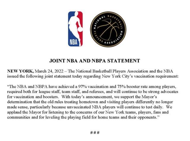 NBA官方随后发表了声明,内容如下:“NBA联盟和球员工会在球员中实现了97%的疫苗接种率和75%的加强针接种率,联盟所有工作人员、球队工作人员和裁判员也都将继续大力支持疫苗接种和防疫政策。我们通过今天的声明,支持纽约市长的决定,即对主客场球员区别对待的旧规则不再有意义,特别是在没接种疫苗的球员每天都还在进行检测的情况下。我们对纽约市长听取了当地球迷、球员和社区的建议表示赞赏,这为纽约球队和他们的对手创造了公平的竞争环境。”