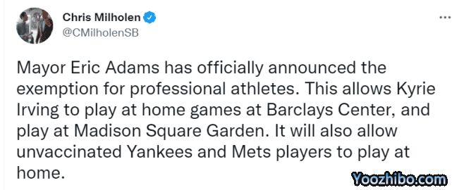 纽约市长埃里克-亚当斯宣布实施新的疫苗政策,对未接种疫苗的运动员和表演者给予豁免,这也意味着欧文正式获准出战主场比赛,他将在下周一(北京时间3月28日)对黄蜂的比赛中上演主场首秀!