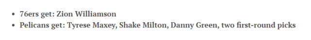 具体方案是76人送出马克西、米尔顿、丹尼-格林、两个首轮,得到锡安。