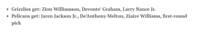 具体方案是灰熊送出小杰克逊、梅尔顿、扎伊尔-威廉姆斯和一个首轮,得到锡安、格拉汉姆和小南斯。