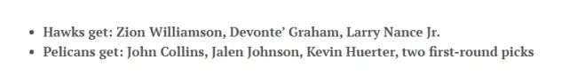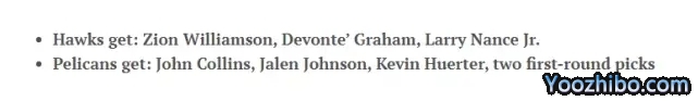 具体方案是老鹰送出约翰-科林斯、杰伦-约翰逊、赫尔特和两个首轮,得到锡安、格拉汉姆和小南斯。