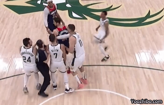 第三节还剩51.8秒时,萨托兰斯基勾手被大洛佩斯封盖,他认为雄鹿球员有犯规动作,但裁判没有理会。阿伦拿到后场篮板,而这时候不满的萨托兰斯基挥出手臂,放倒了正在向前跑的阿伦。阿伦倒地后马上起身,想要找萨托兰斯基算账,大洛第一时间拦住他,避免事态升级。