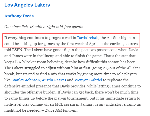 在今年2月17日对阵爵士时,浓眉踩到戈贝尔的脚后跟导致脚踝严重扭伤,最终确诊为中足扭伤,因伤缺席长达一个多月;而最近一段时间,浓眉一直随队出征,并且在赛前进行投篮训练,伤势康复很顺利。