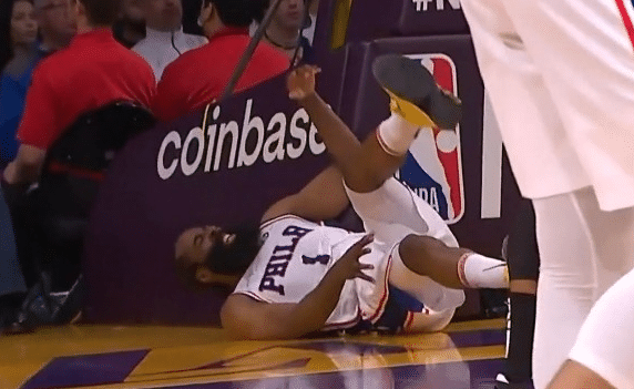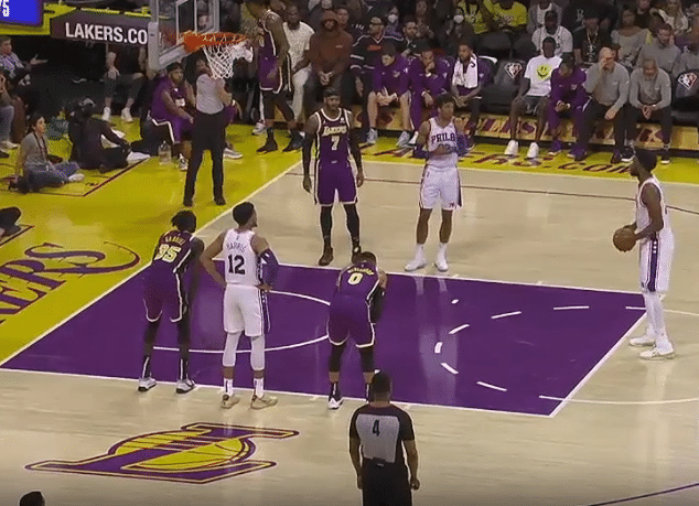 末节的比赛开始后,小乔丹篮下暴扣得手,安东尼中投命中,马克西三分回应,镜头给到场边,此前受伤离场的哈登回到了替补席,小乔丹空接暴扣得手,科克马兹中投得手,76人取得了7分的领先优势,湖人请求暂停。末节比赛还剩6分钟的时候,哈登重新回到了场上,霍华德连造恩比德,哈登犯规上罚球线。