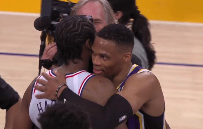 赛后威少拥抱恩比德和哈登,并且和哈登有说有笑,如此画面太暖心。
