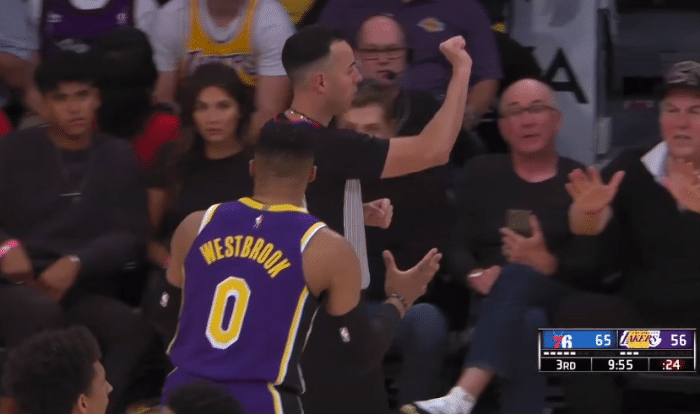 下半场,湖人第三节一直落后10分左右,威少突破哈登并且晃飞恩比德上篮得分,之后因不满判罚而怒吼抱怨吃到技术犯规;威少再次失误,传球直接被哈登抢断,所幸里夫斯成功反抢;随后威少终于命中三分球,第三节最后1分53秒,威少上场再次命中三分。