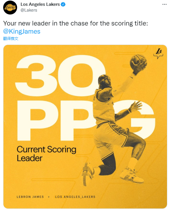 JRS直播03月23日讯 湖人官方为詹姆斯冲击得分王造势,晒出詹姆斯场均30分领跑联盟,发推写道:詹姆斯是得分王之争新的领头羊;若37岁詹姆斯夺得本赛季得分王,他将创造新的历史,成为史上最年老得分王。