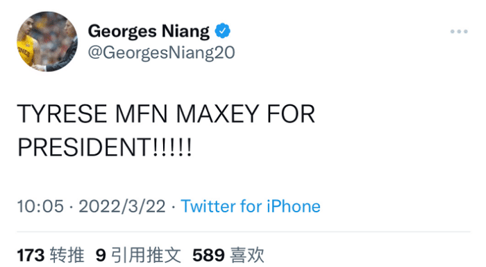 赛后76人球员尼昂在社交媒体上吹爆马克西,称:“马克西当总统!!”此役尼昂首发出战,砍下15分4板4助的数据。