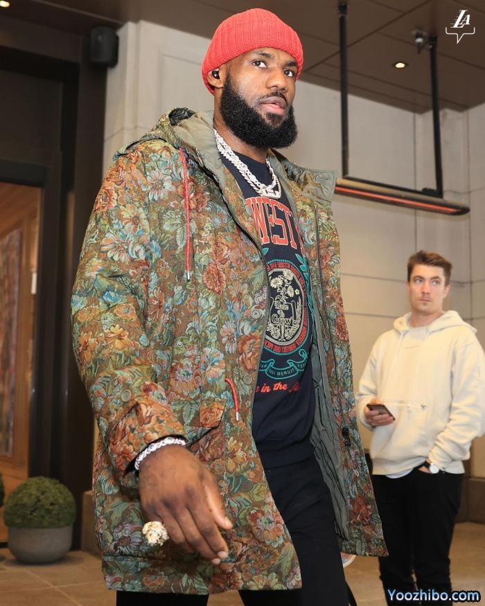 詹姆斯重返克利夫兰,赛前入场抵达骑士主场时,詹姆斯身穿炫酷的外套、戴着针织红帽出境,手上佩戴的硕大戒指十分抢镜。