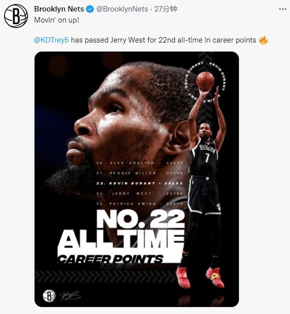 JRS直播讯 北京时间3月22日,NBA常规赛篮网主场114-106击败爵士,杜兰特全场出战38分钟23投15中、三分7中4轰下37分8助攻9篮板1抢断,杜兰特迎来里程碑时刻,常规赛总得分正式超越湖人名宿杰里-韦斯特升到历史第22位,现役仅次詹姆斯和安东尼排在联盟第三位。