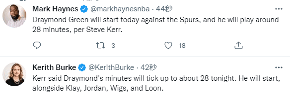 格林伤愈复出后已经连续两场替补出战,对阵奇才上场20分钟拿到6分7篮板6助攻,对阵凯尔特人,上场22分钟拿到2分8篮板3助攻2抢断;格林复出后首次首发出战,时隔2个多月重回首发,搭档汤普森、维金斯、卢尼和普尔首发出战。