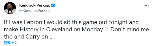对于詹姆斯今天是否该出战,名嘴帕金斯发推:如果我是勒布朗,我不会参加今晚的比赛,然后周二在克利夫兰创造历史!!不要介意我这么说。