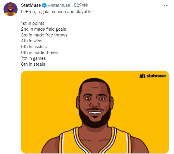 JRS直播03月20日讯 ,美媒StatMuse把推特头像换成詹姆斯的漫画照,晒出詹姆斯常规赛+季后赛的九大关键数据都排在历史前十之列——总得分历史第一、总进球数历史第二、总罚球命中数历史第三、总胜场数历史第四、总助攻历史第五、总三分命中数历史第六、总出场数历史第七和总抢断数历史第八。